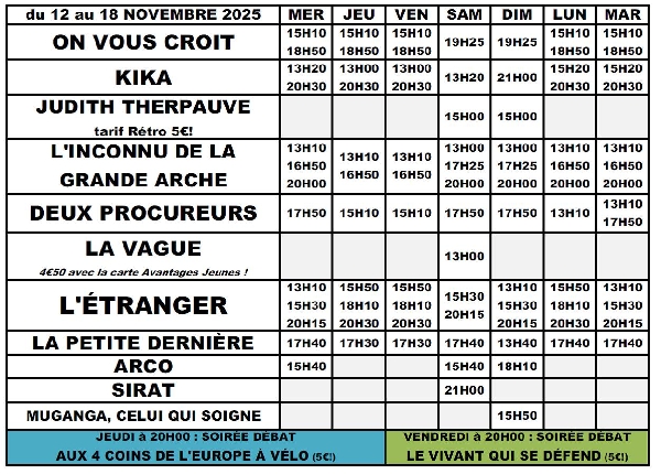 Programme du mercredi 12/11/2025 au mardi 18/11/2025:
