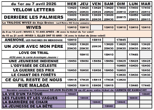 Programme du mercredi 01/04/2026 au mardi 07/04/2026: