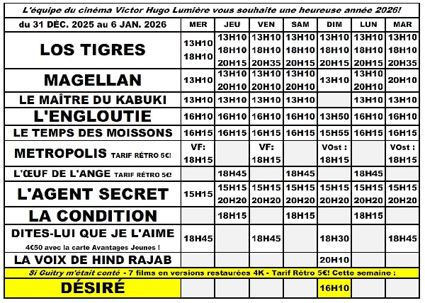 Programme du mercredi 31/12/2025 au mardi 06/01/2026:
