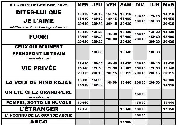 Programme du mercredi 26/11/2025 au mardi 02/12/2025: