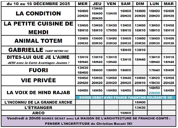 Programme du mercredi 10/12/2025 au mardi 16/12/2025: