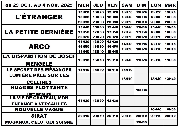 Programme du mercredi 29/10/2025 au mardi 04/11/2025: