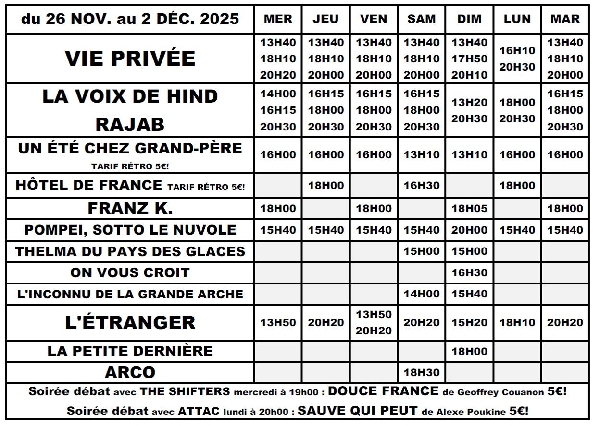 Programme du mercredi 26/11/2025 au mardi 02/12/2025: